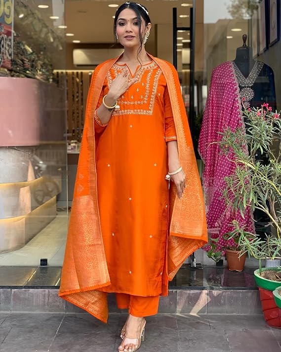 Women’s Silk Blend Straight Embroidered Kurta with Pant & Dupatta, Orange