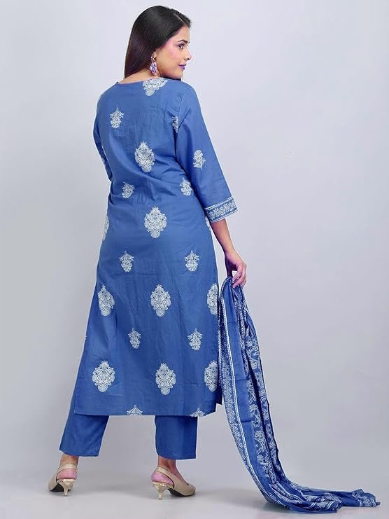 Women’s Pure Cotton Printed with Handwork Kurta Set, Navy Blue